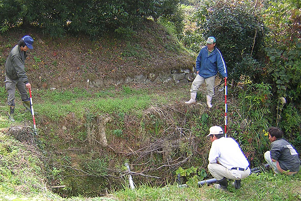 水路上の道が半分ほど崩落している。