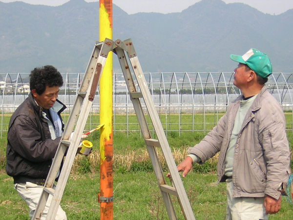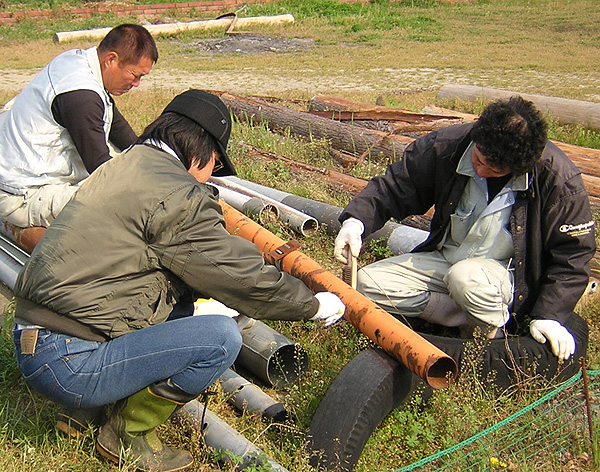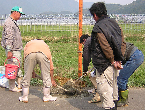 錆を落として穴を掘り土台にセメントを流し込む。